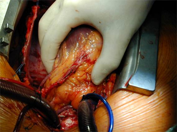 Abb. 3. Intraoperative Aufnahme: Anlage eines Bypass (linke innere Brustarterie - Arteria mammaria int. sin.) auf die die linke Kranzarterie (Ramus interventricularis ant.).