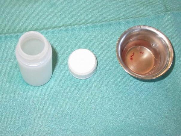 Abb. 2. 4-6 Gewebeproben von verschiedenen Orten des rechen Ventrikels. Diese werden für den Transport zum Pathologen in den Plastikbehälter links gefüllt, bei Aufarbeitung am gleichen Tag kommen sie in 0,9% Kochsalzlösung, bei längerer Lagerung in 4% Formalin.